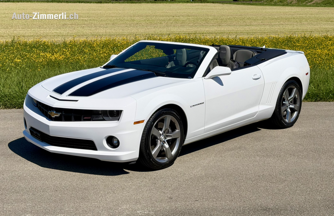 CHEVROLET Camaro 2SS/RS 376-CID 6,2L V8 Cabriolet, Hydra-Matic 6L80 6-Gang-Automatik-Getriebe mit Tapshift Wippen am Lenkrad, 2SS Package, RS Package, el. versenkbares Stoffdach, Head-up-Display, Zylinder abschaltung für sparsamen Benzinverbrauch, Fernbedienung mit Funk-Motor-Starter Funktion und ZV, schwarzes Lederinterieur, Rear Diffusor, Angel Eyes LED und HID BI-Xenon Scheinwerfer, Multifunktions Sportlederlenkrad, Sitzheizung, Aussenspiegel el. verstellbar/beheizbar/abblendbar, StabiliTrak Stabilitätskontrolle ESP, Domstrebe, el. Traktionskontrolle TCS, Antiblockiersystem ABS, Sportfahrwerk, Boston Soundsystem Radio AM/FM CD MP3 mit 9 Lautsprecher 245 Watt und USB in der Mittelkonsole, Bluetooth für Natel eingerichtet, RS Heckspoiler, Klimatisierungsanlage, Lichtautomatik, Scheibenwischer mit Regensensor, Rückfahrsensoren, RS Alufelgen in midnight silver 20“ x 8“ vorne und 20? x 9? hinten mit 275/40R20 Zoll Pirelli P Zero Bereifung, Brembo Bremsanlage mit 4 Kolben Bremszangen, hinten und vorne innen- belüftete Scheibenbremsen, Reifendrucksensoren mit Anzeige am Monitor, Engine Cover / Motorabdeckung, el. verstellbare Sport Ledersitze in beige mit weissen Nähten und eingesticktem SS Logo, 4 Sitze, Servolenkung, el. Fenster mit Automatik Funktion, DIC Driver Information Center in Deutsch, in Wagenfarbe lackierter Heckspoiler, der Tempomat ist am Lenkrad bedienbar, Gepäckraumnetz, RS Rückleuchten, Doppel- und Seitenairbags vorne, Kopfairbags vorne und hinten mit Sitzflächenerkennung, Tagfahrlicht, ISOFIX Kindersitzvorrichtung, beleuchteter Einstieg, Diebstahlwarnanlage PASS Key III, höhenverstellbare Lenksäule, 72 Liter Benzintank, Heckantrieb, gesperrte Hinterachse, 3 integrierte Sender für Garagentore, die hintere Sitzbank ist abkplappbar, Haifischflossen Antenne, Automatisch abblendbarer Rueckspiegel, Persening in schwarz, Gewichtsverteilung 52% vorne & 48% hinten, Leergewicht 1779 Kg, Aluminium V8 SFI L99 Motor mit 6162ccm Hubraum und Direkteinspritzung und aktivem Treibstoffmanagement, 553 Nm bei 4500 U/min, 299 Kw / 426 PS bei 5000 U/min
