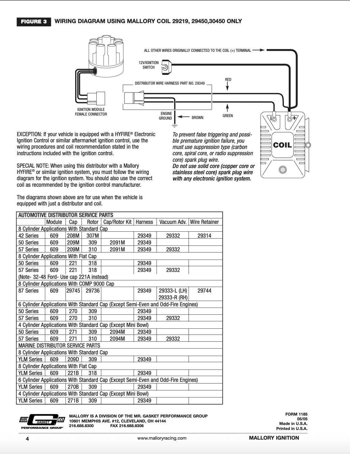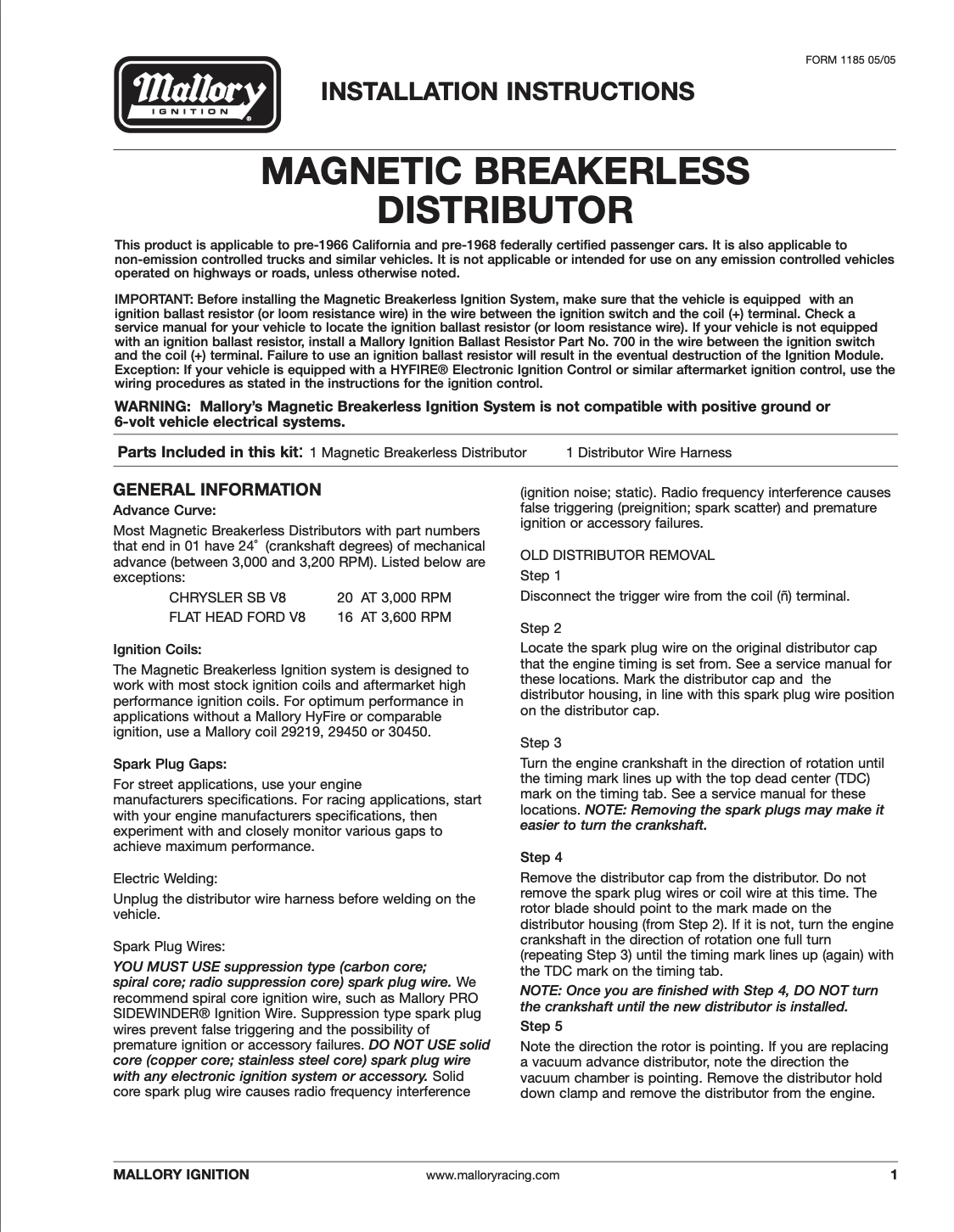 Bewährter elektronischer Verteiler von Mallory für Ihren Flathead Ford von 1949-1953. Mit magnetischer unterbrecherloser Zündtechnologie für deutlich verbesserte Genauigkeit im Vergleich zu den Zündverteiler mit Unterbrecher, nur für 12-Volt-Systeme, einfacher 3-Draht-Anschluss, einstellbarer mechanischer Zundvorschub, Selbstschmierende Buchsen sorgen für jahrelangen störungsfreien Betrieb, Mallory Super-Duty-Kappe und Rotor mit Messingklemmen