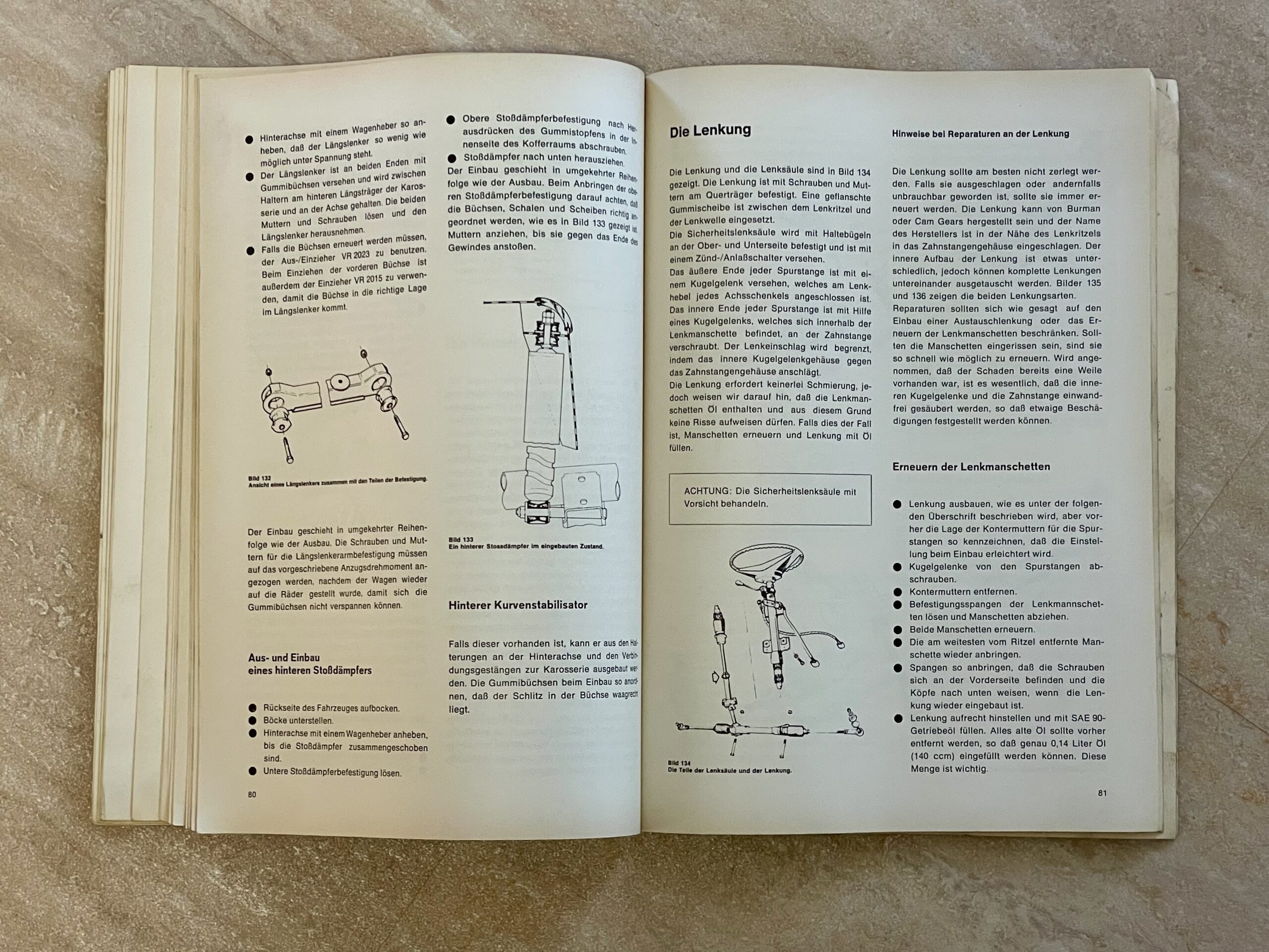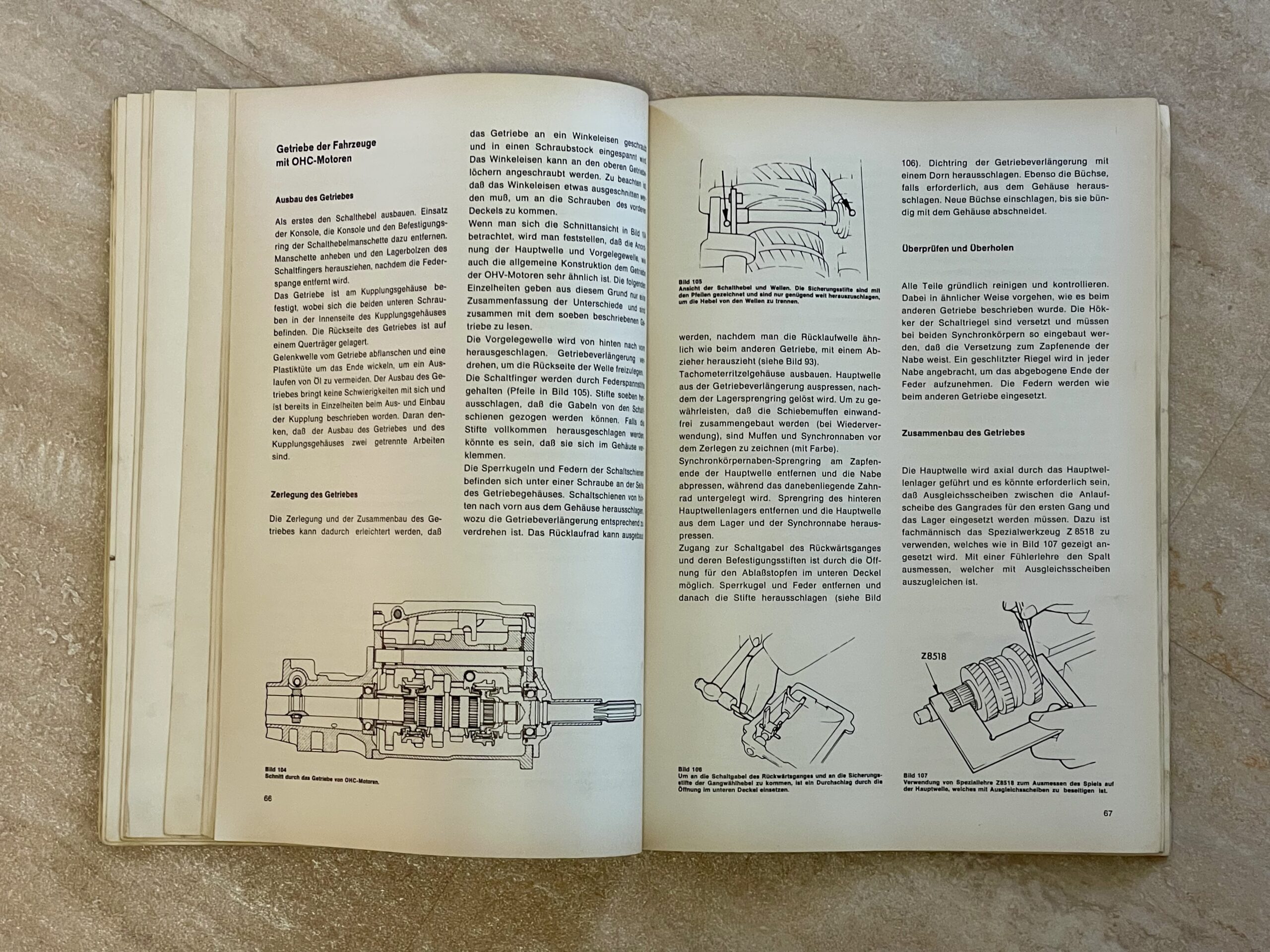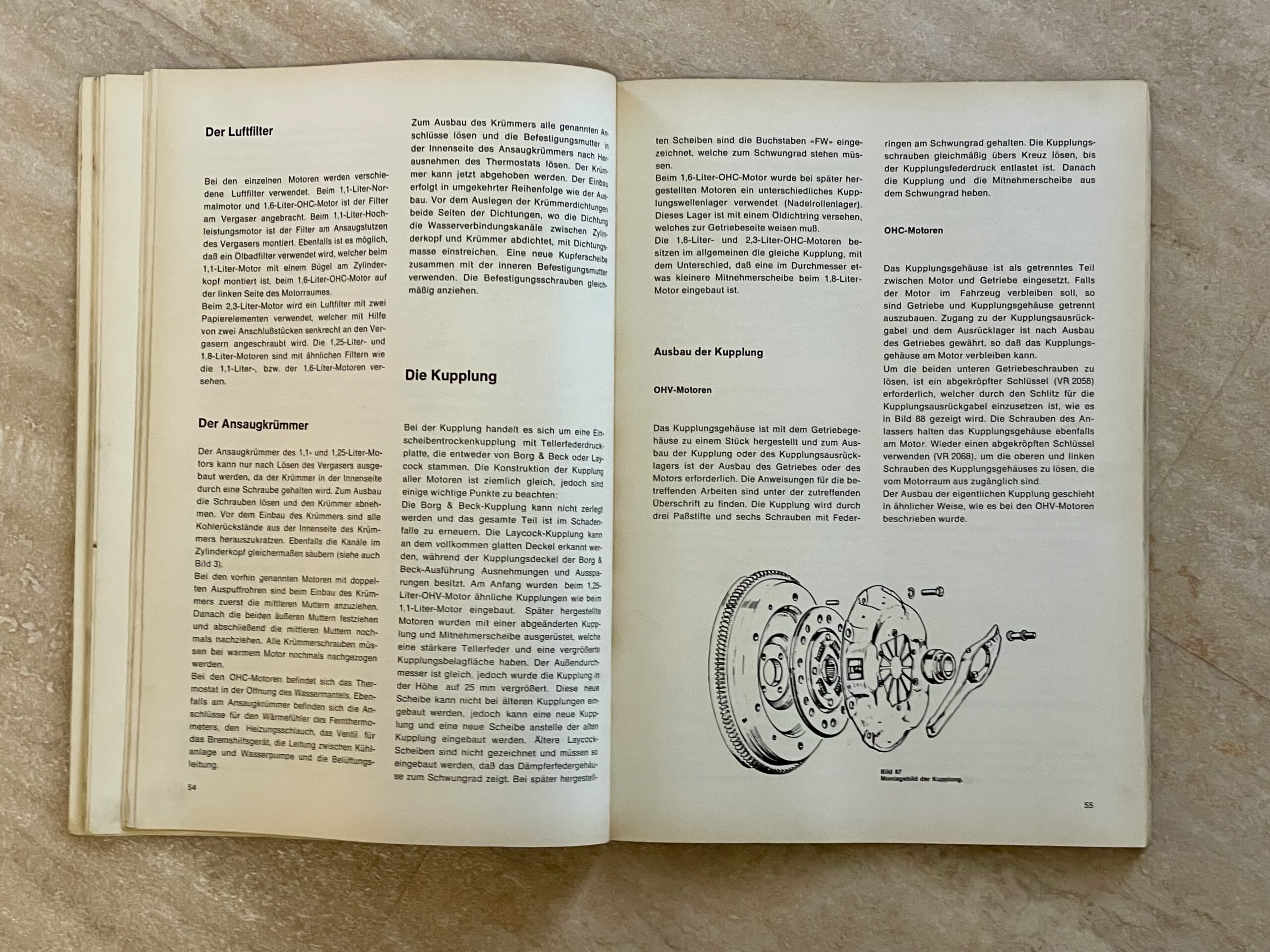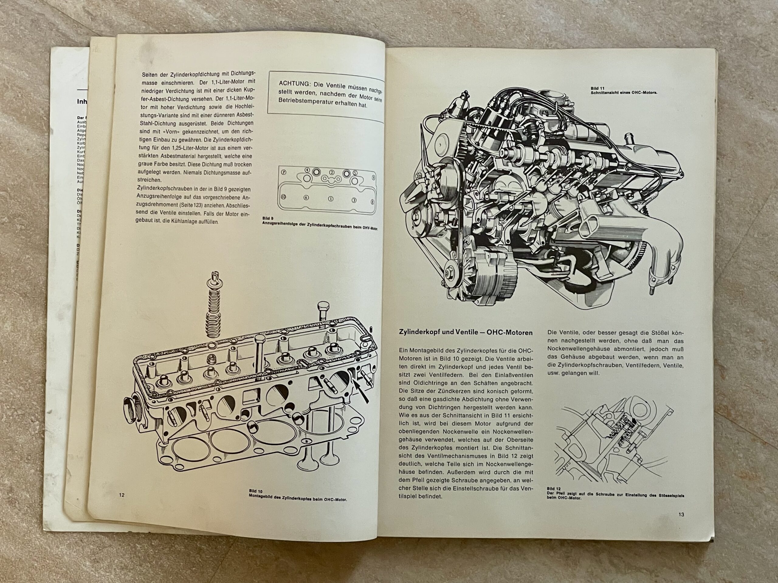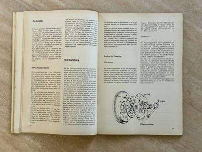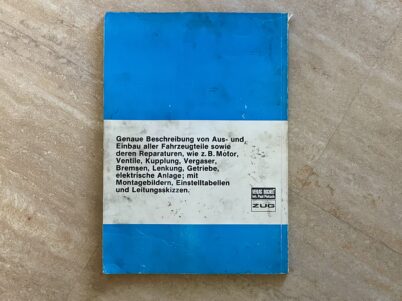 Genaue Beschreibung von Aus- und Einbau aller Fahrzeugteile sowie deren Reparaturen, wie z. B. Motor, Ventile, Kupplung, Vergaser, Bremsen, Lenkung, Getriebe, elektrische Anlage; mit Montagebildern, Einstelltabellen und Leitungsskizzen.