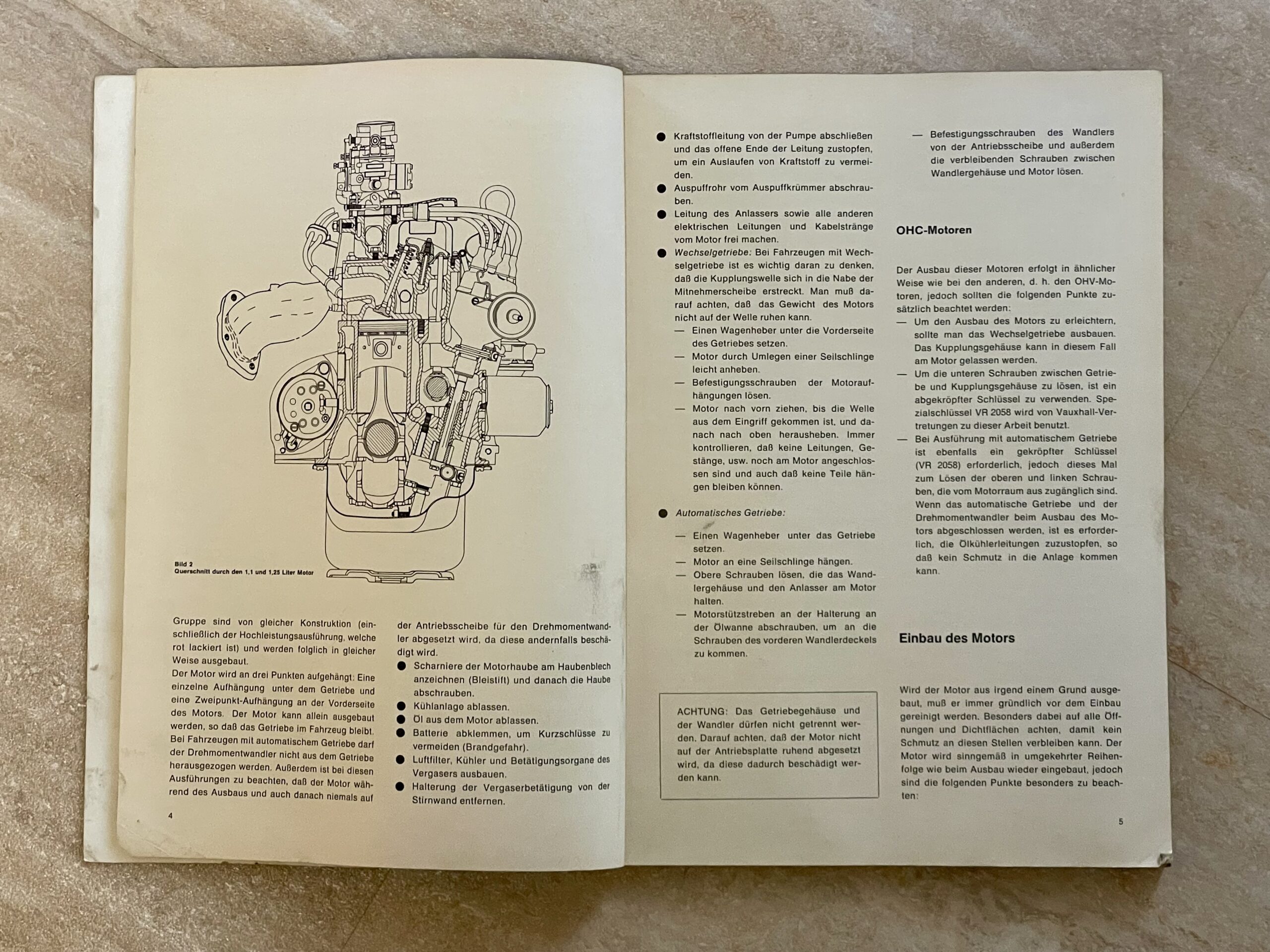 Die in dieser Werkstatthandbuch behandelten Vauxhall-Viva-Modelle können mit einem von fünf verschiedenen Motoren ausgerüstet sein. Bis zum Jahre 1972 wurde der Viva in allen Ausführungen entweder mit dem 1158 ccm oder dem 1598 ccm-Motor geliefert. Seit 1972 wurden dann größere Motoren eingebaut, und zwar ein 1256 ccm-Motor oder ein 1759 ccm-Motor. Außerdem wurde die De-Luxe- und SL-Version des Vivas mit einem 2,3-Liter-Motor gebaut. Eine zweitürige Coupe-Version des Vivas wird unter dem Namen Vauxhall Firenza gehandelt, die ebenfalls als De-Luxe- und SL-Versionen erhältlich waren und mit den neuen Motoren ausgerüstet wurden. Die Kurbelwelle der beiden kleineren Motoren ist dreifach gelagert, während diejenige der drei größeren Motoren fünffach gelagert ist. Die beiden kleineren Motoren können auch hinsichtlich der Nockenwelle unter einer Gruppe zusammengefaßt werden, da die Nockenwelle, in der Seite des Motors eingesetzt, durch eine Kette angetrieben wird, während die drei grös-seren Motoren eine durch Zahnriemen ange-triebene, obenliegende Nockenwelle besitzen. Auf alle weiteren Unterschiede innerhalb der einzelnen Motoren wird unter den einzelnen Abschnitten im weiteren Text diesem Wartungshandbuch eingegangen.